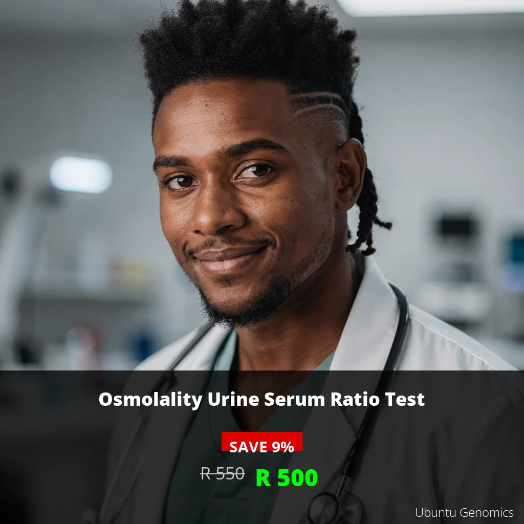 The Osmolality Urine Serum Ratio Test is a crucial diagnostic tool that provides valuable insights into your kidney function and overall hydration status. For just ZAR 500, this comprehensive test helps detect early signs of kidney dysfunction, electrolyte imbalances, and hydration issues that could impact your long-term health. Our advanced freezing point depression method ensures exceptional accuracy and reliability in every result. Many South Africans experience subtle symptoms like fatigue, swelling, or changes in urination patterns without realizing these could indicate underlying kidney concerns. With same-day reporting available when samples are submitted by 3 pm, you can get peace of mind quickly and take proactive steps toward better health. Trust DNA Labs Africa for professional, compassionate care that puts your wellbeing first.
